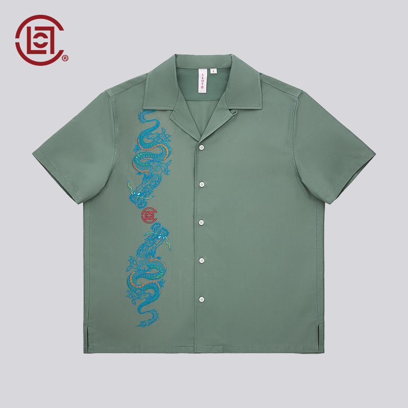 欧洲陈冠希同款龙纹短袖宽松休闲衬衣春夏季复古半袖上衣服外套潮