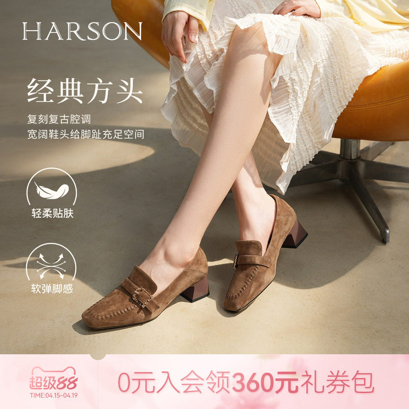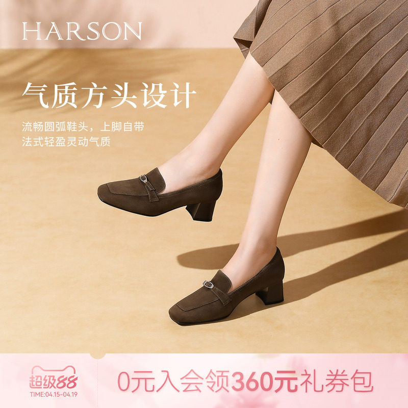哈森气质方头绒面乐福鞋静音高跟老钱风单鞋女2025新款HWL250129