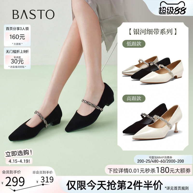 百思图26春商场新款尖头粗跟绒面高跟鞋玛丽珍法式女单鞋W0128AQ6