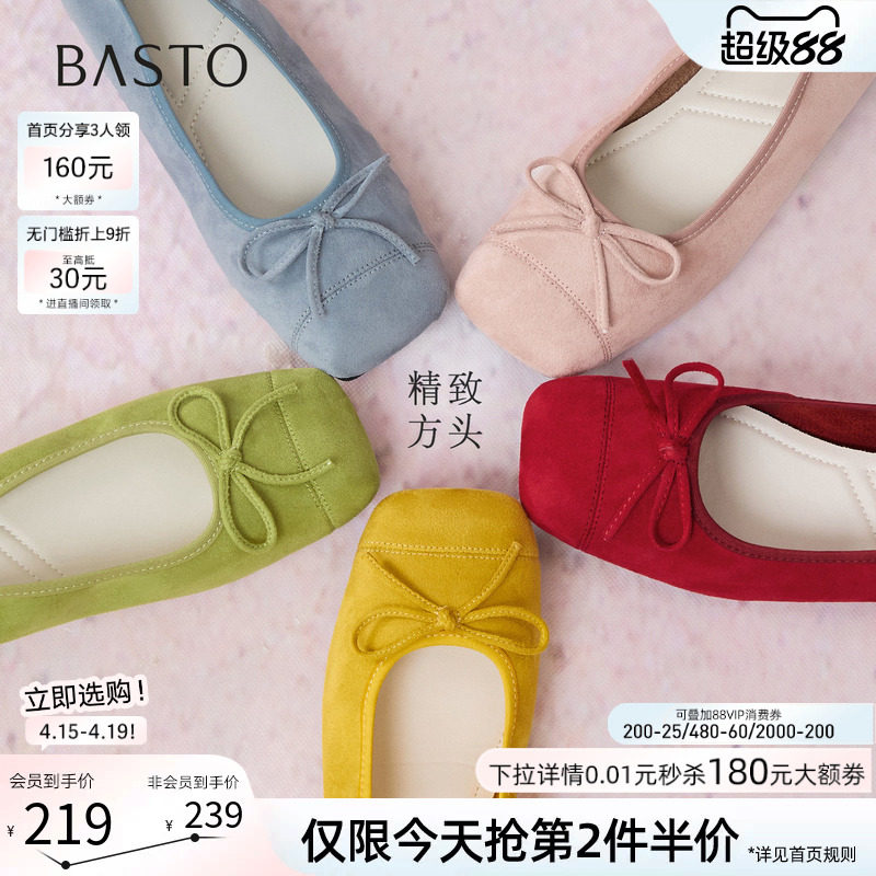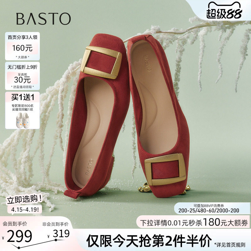 百思图26春季新款红色芭蕾单鞋绒面浅口蛋卷鞋平底女布鞋B2700CQ5