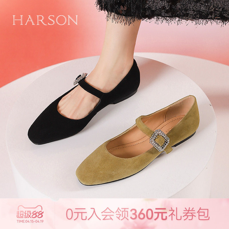 哈森玛丽珍女鞋春新款复古绒面水钻单鞋低跟女鞋HWS240192