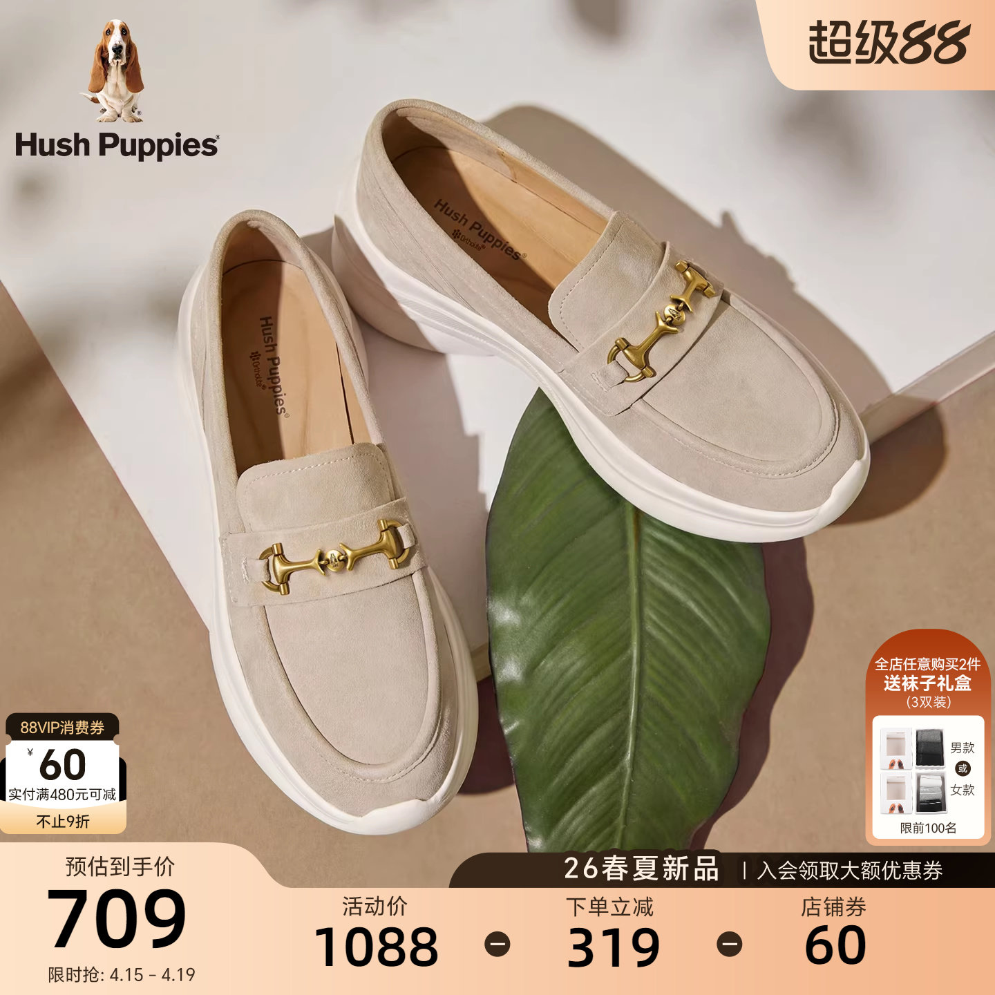 暇步士英伦风乐福鞋女26春夏新款绒面厚底金属扣一脚蹬增高单鞋女