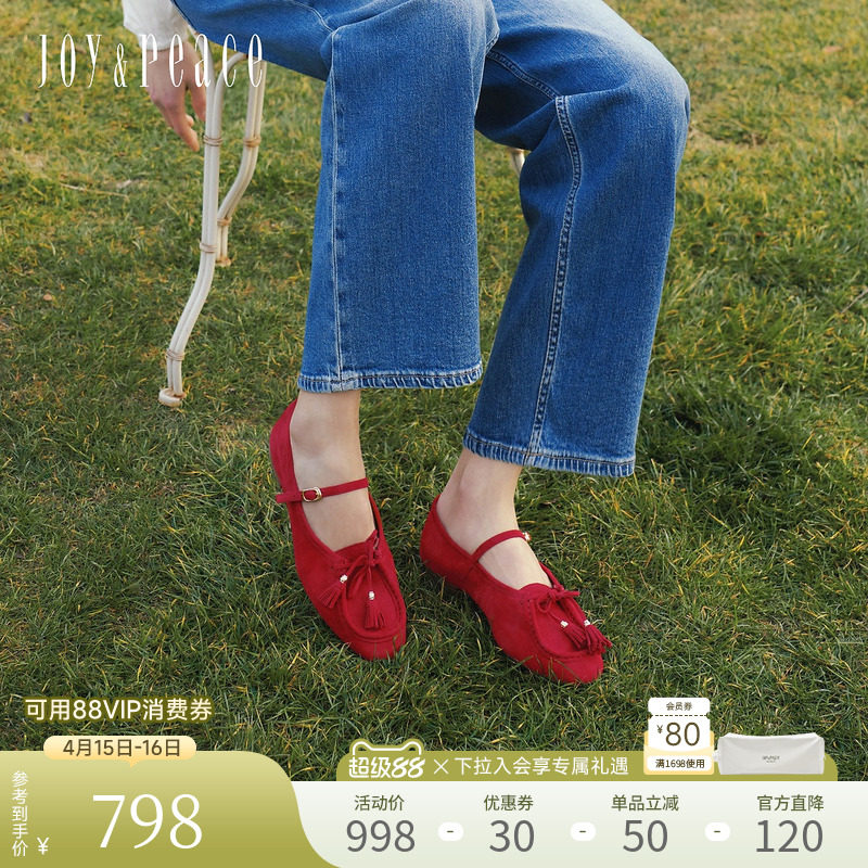 真美诗2026春新款羊皮绒面流苏蝴蝶结平底单鞋玛丽珍鞋女YOK89AQ6