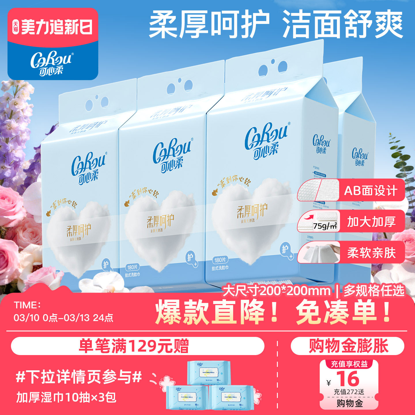 可心柔壁挂式洗脸巾一次性干湿两用洁面巾婴儿悬挂绵柔巾擦脸抽取