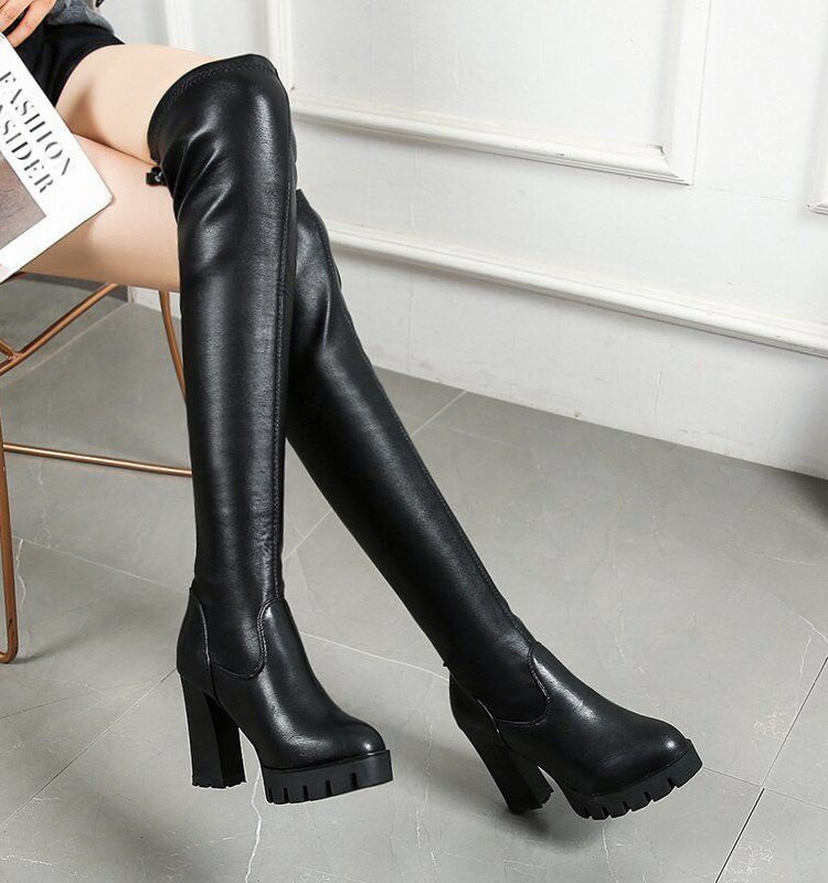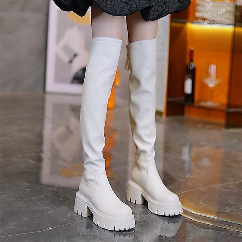 2021新款粗跟高跟圆头长筒靴单A靴女春秋冬百搭防水台弹力过膝裸