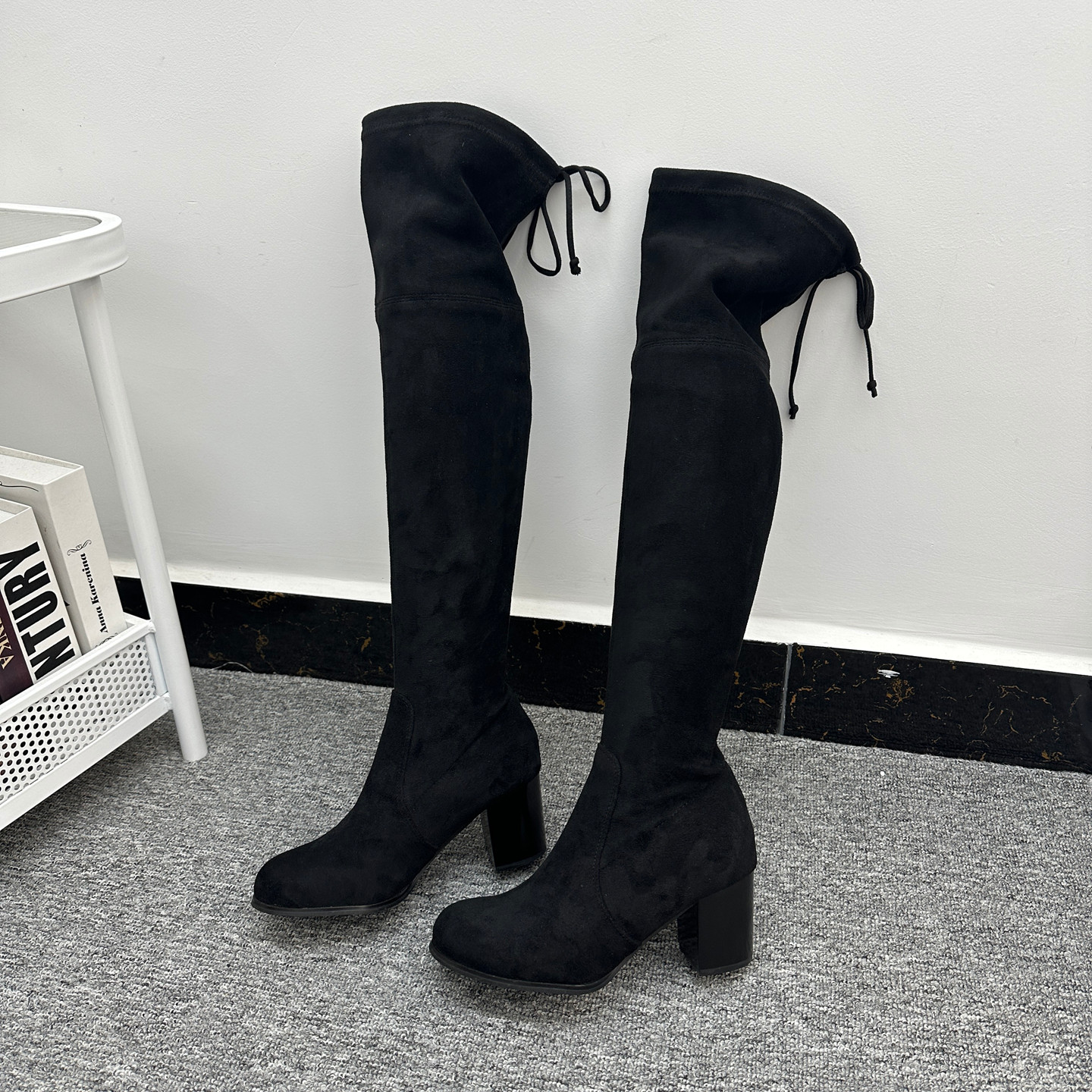 外贸原单时尚洋气绒面圆头粗跟中跟后系带长筒过膝长靴女鞋瘦瘦靴