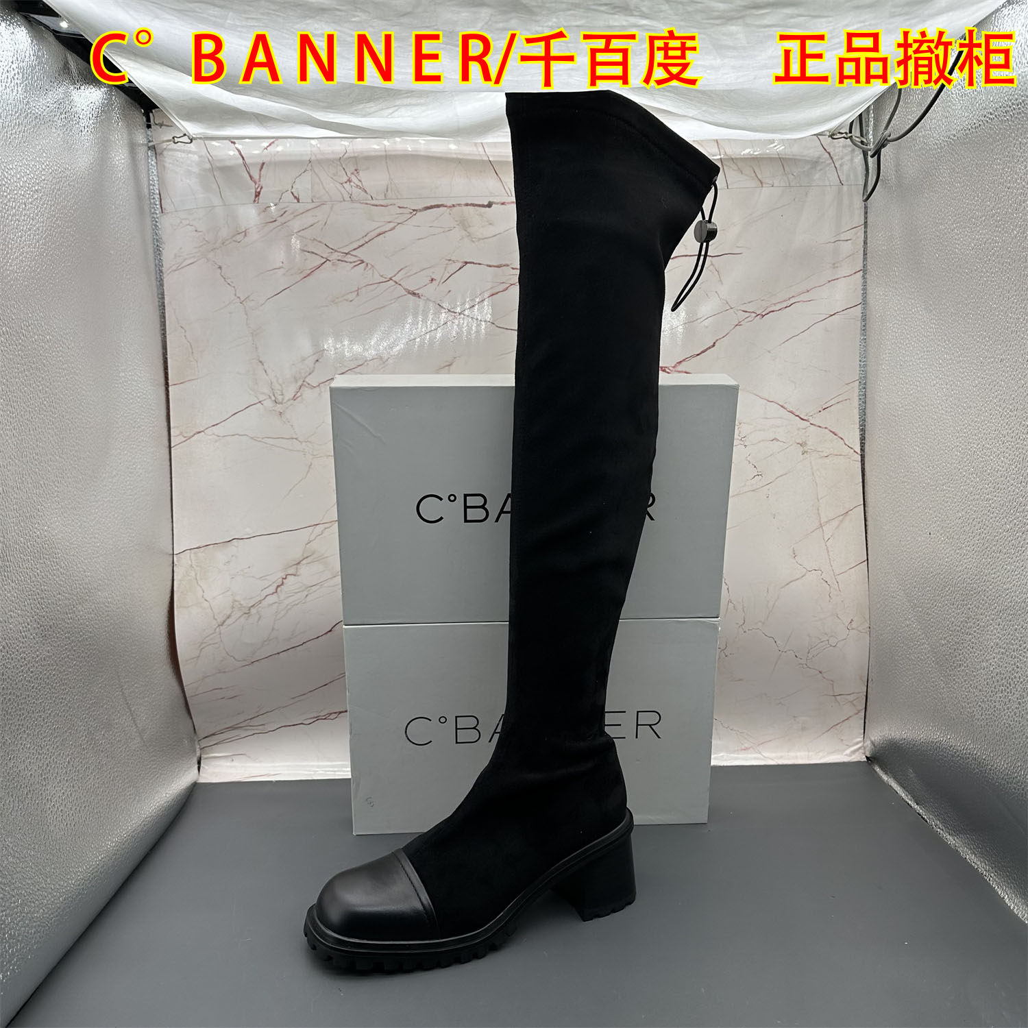 C.BANNER千百度撤柜断码处理女鞋粗跟高跟圆头套筒过膝弹力长靴