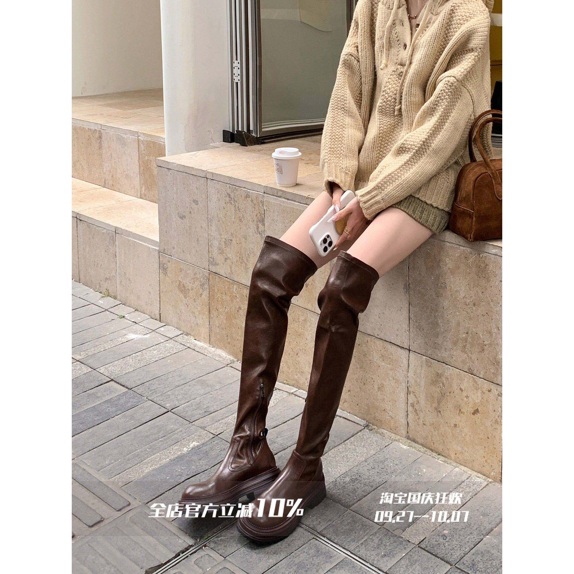 【benefanfan】晶晶同款系带过膝靴弹力瘦瘦靴圆头粗跟真皮高筒靴