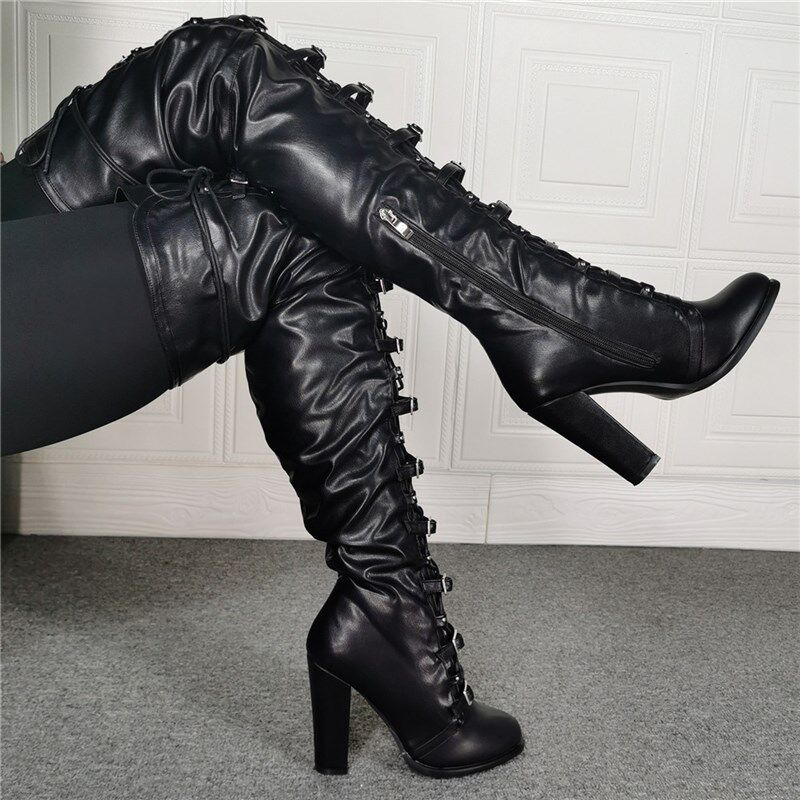 大码过膝长靴女粗跟圆头大腿靴绑带超长靴高跟系U带马丁靴弹力靴