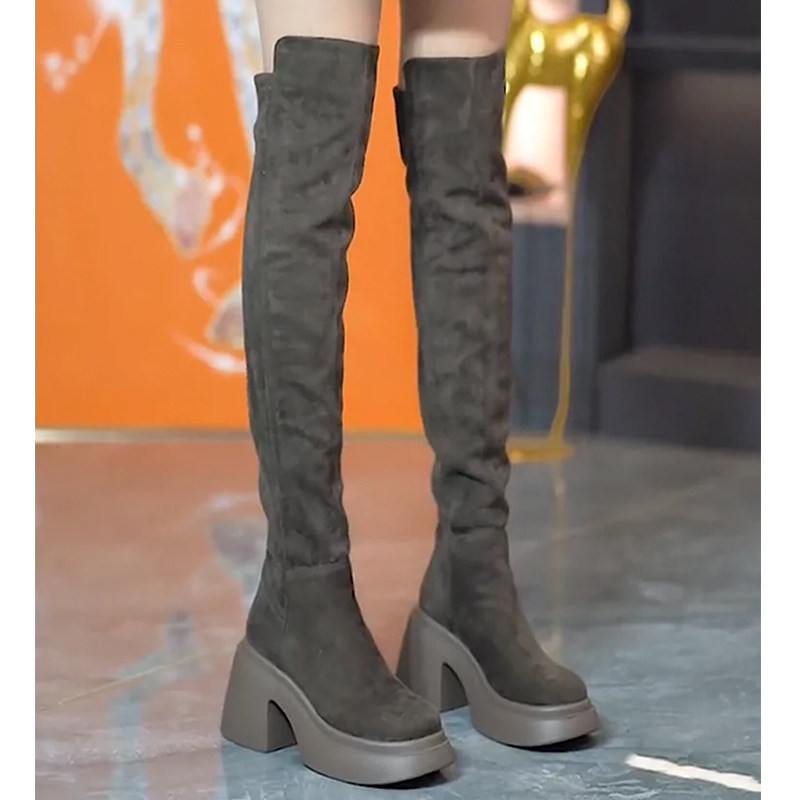 过膝靴女高跟弹力长筒靴秋冬季圆头小个子绒面粗跟高筒瘦瘦长靴女