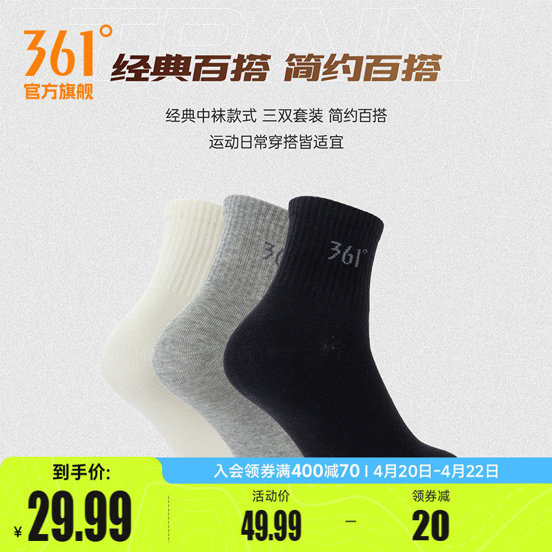 361度男中筒白袜运动长筒棉袜秋冬季三双装防臭吸汗纯色黑色长袜