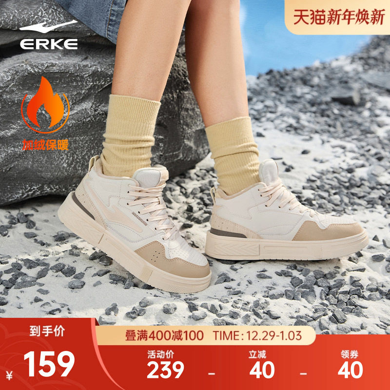 征服鸿星尔克板鞋高帮女鞋加绒棉鞋冬季新款鞋子厚底休闲鞋运动鞋