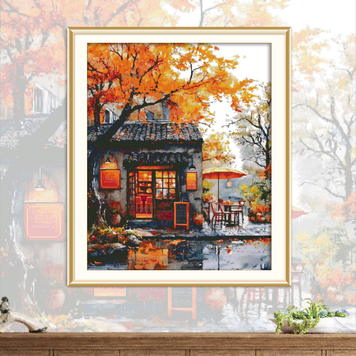 ks十字绣新款枫影咖香非满绣自己绣手工棉线咖啡馆秋天景象DIY