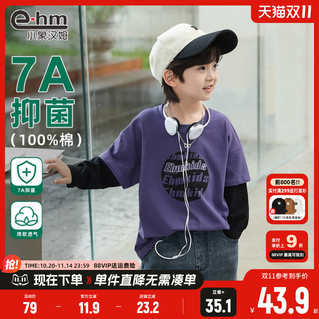 小象汉姆童装男童长袖t恤儿童打底衫假两件纯棉2025秋装新款洋气