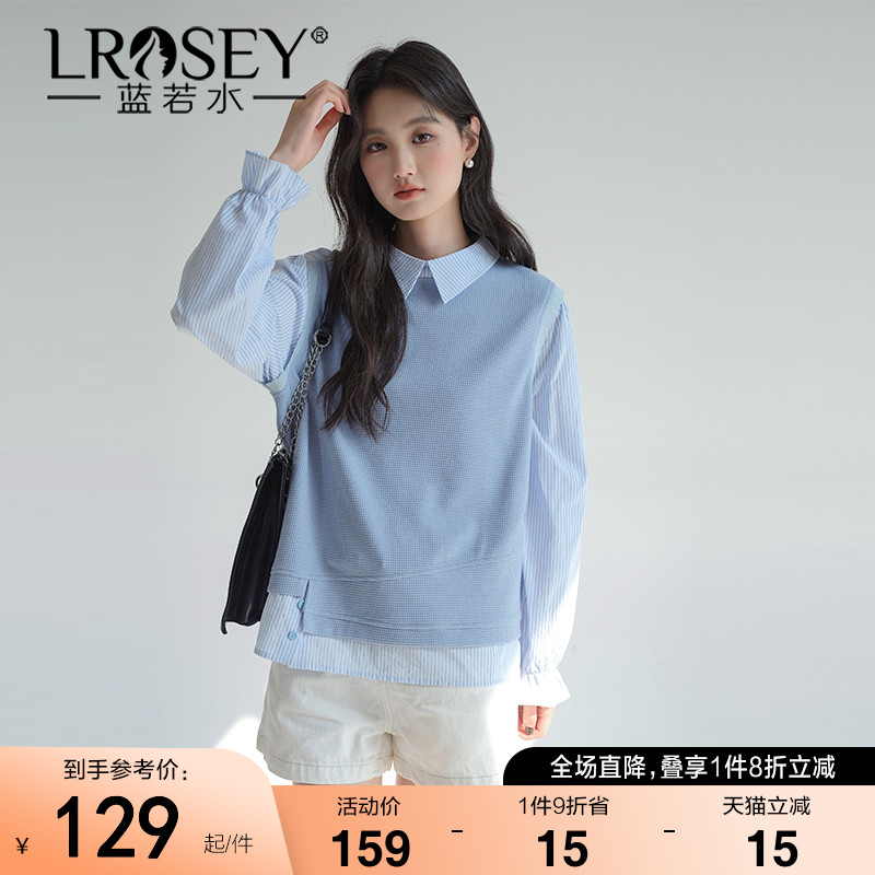 蓝若水大码女装2025秋新款上衣胖MM华夫格拼接条纹假两件蓝色衬衫