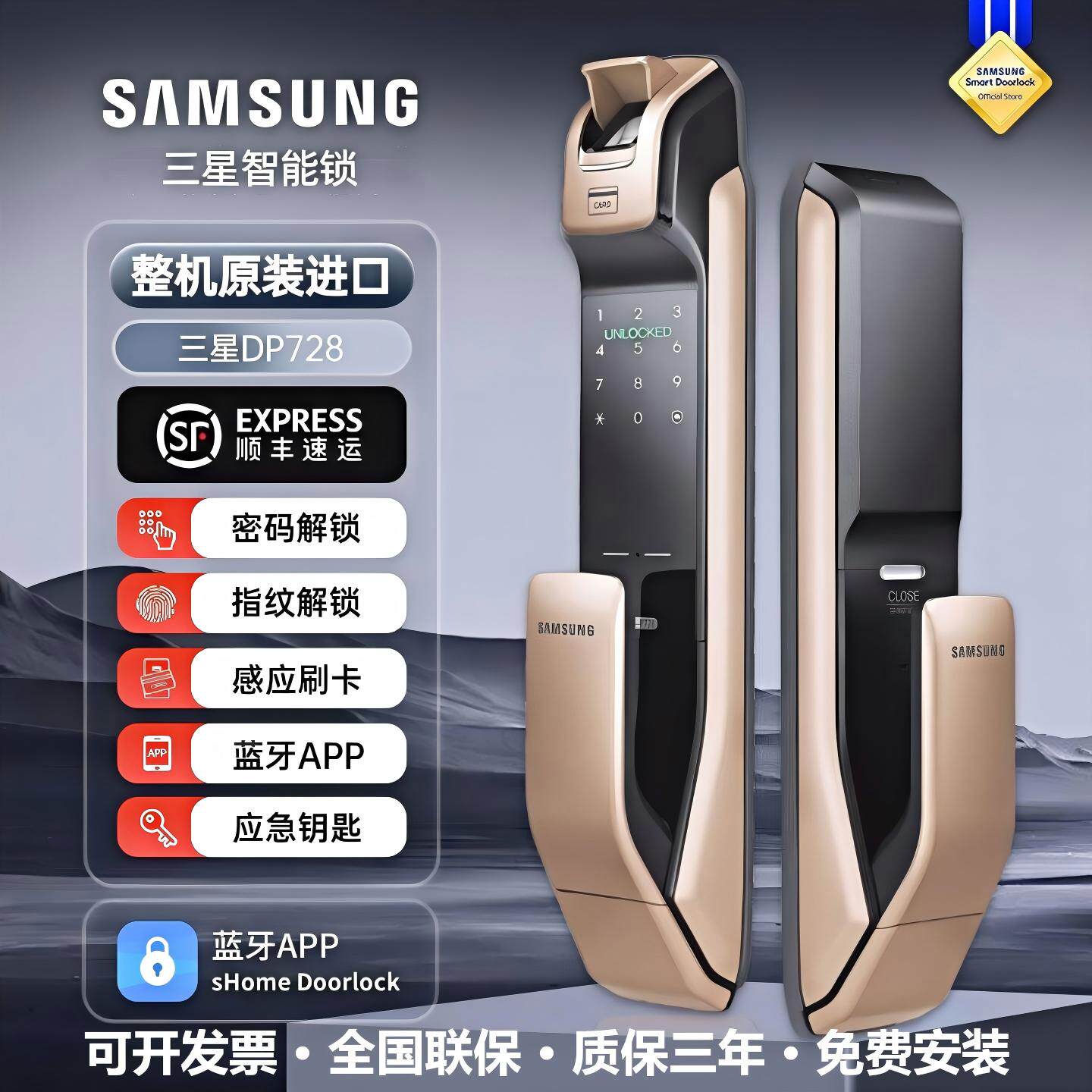 三星指纹锁DP728全自动智能密码锁感应卡锁电子锁家用防盗智
