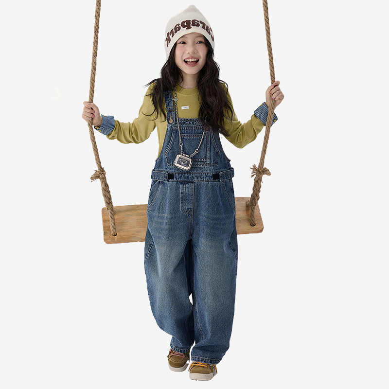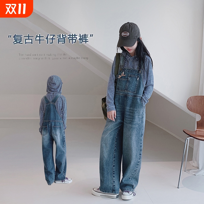 女童春秋复古时髦背带裤中大童韩版宽松气质百搭牛仔裤童潮流裤子