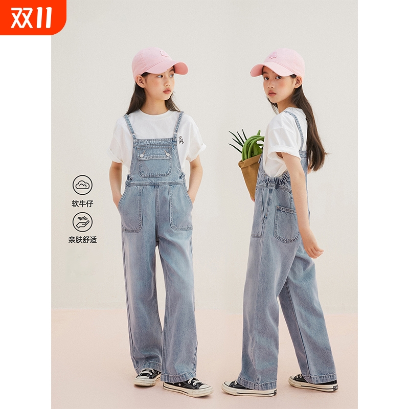 亲子装25春秋款女童背带裤中大童时尚休闲阔腿裤儿童百搭牛仔长裤