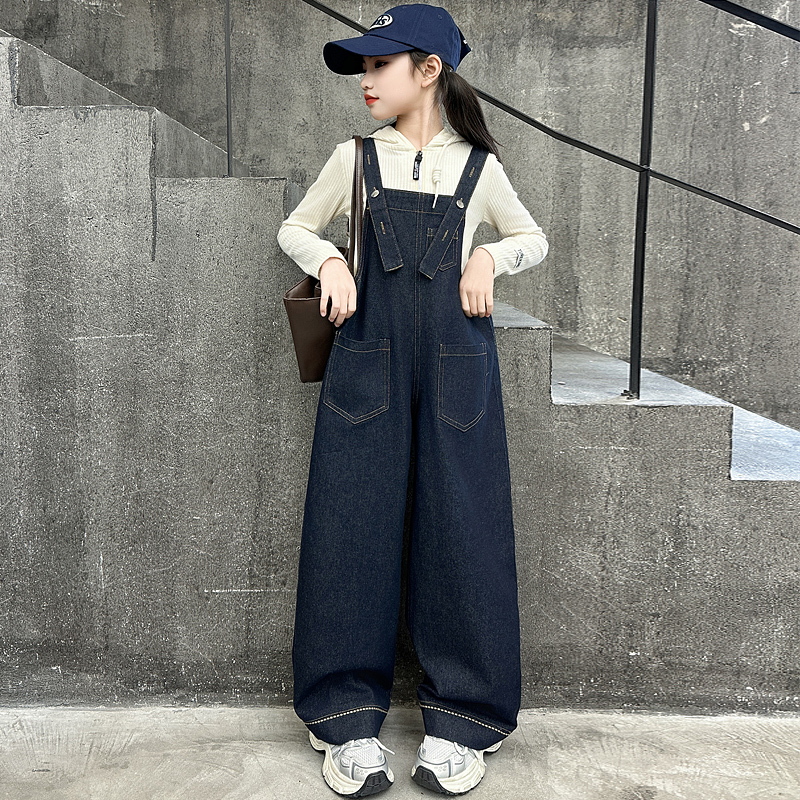 女童牛仔背带裤直筒宽松阔腿秋装儿童连体裤长裤中大童休闲长裤子