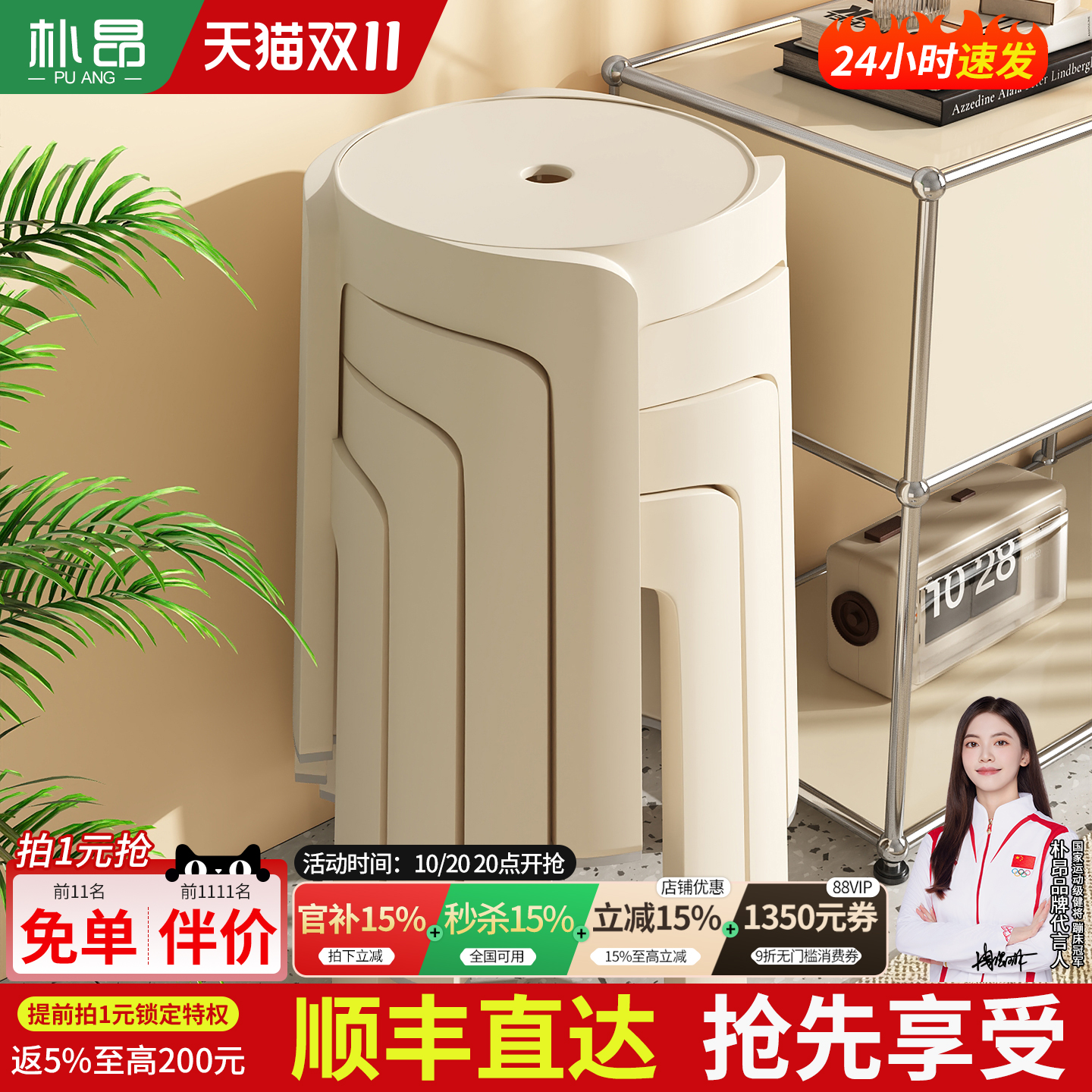 塑料凳子家用软包可叠放加厚结实耐用轻奢高级感圆凳子备用高椅子
