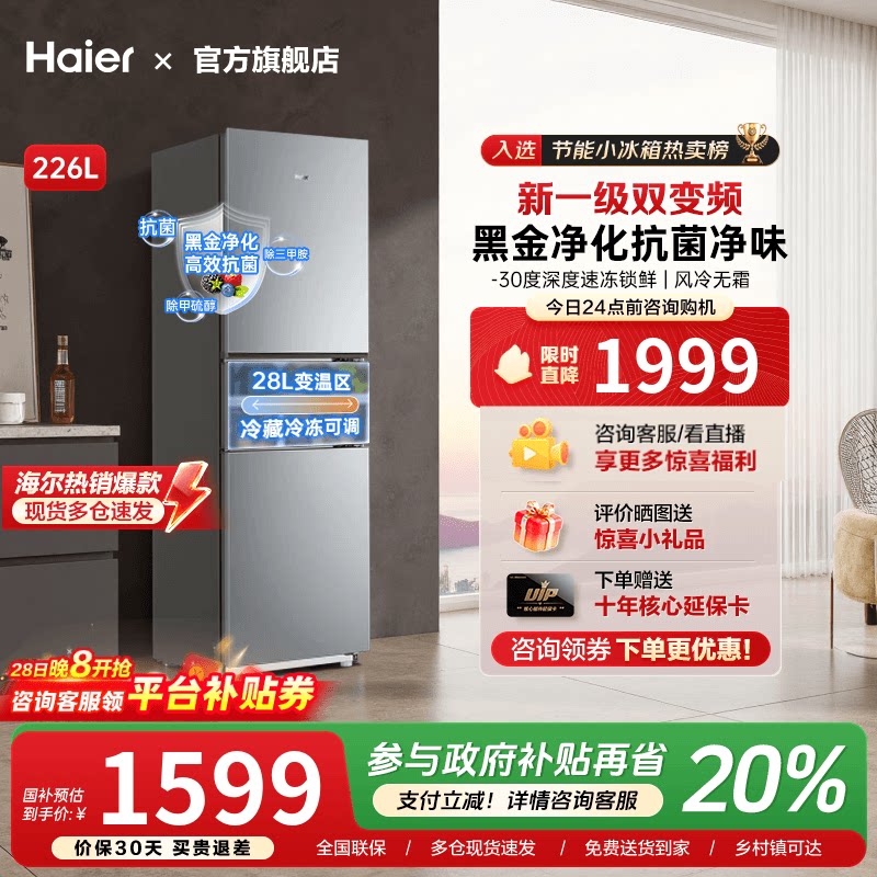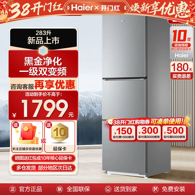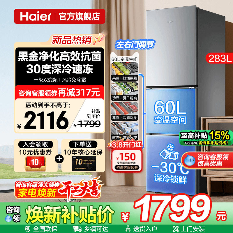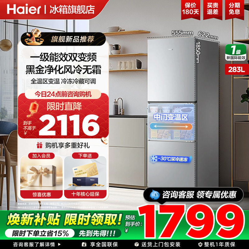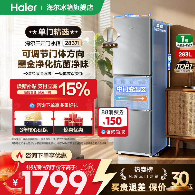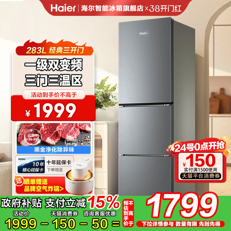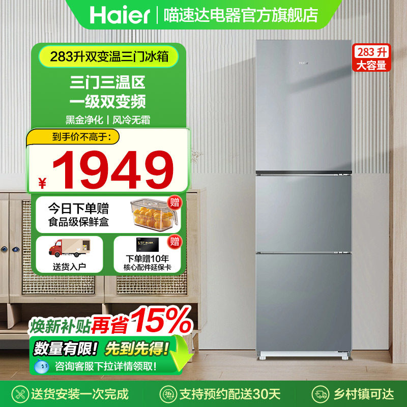 【政府补贴15%】海尔冰箱家用一级变频283L三开门高效抗菌风冷99