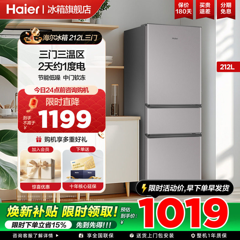 [换新补贴]海尔三开门219L/212升电冰箱家用小型节能租房宿舍旗舰
