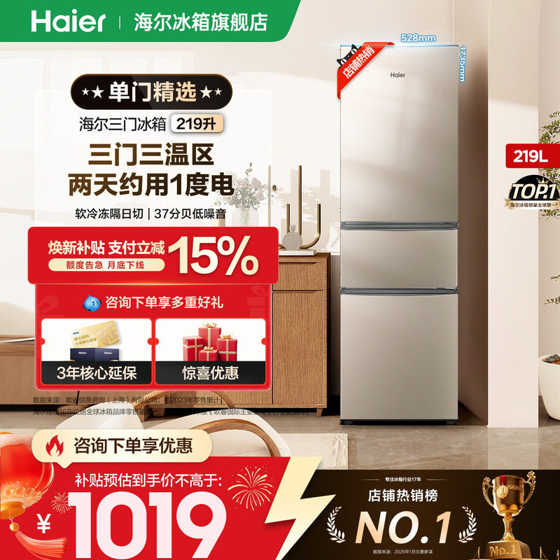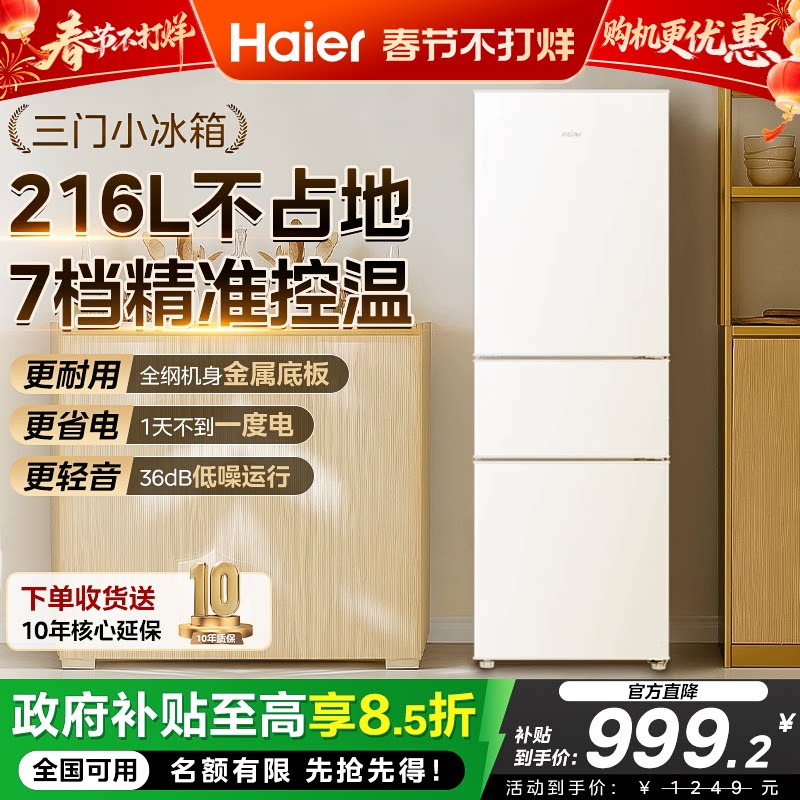 政府以旧换新补贴海尔217L三开门小型家用一级能效省电租房电冰箱