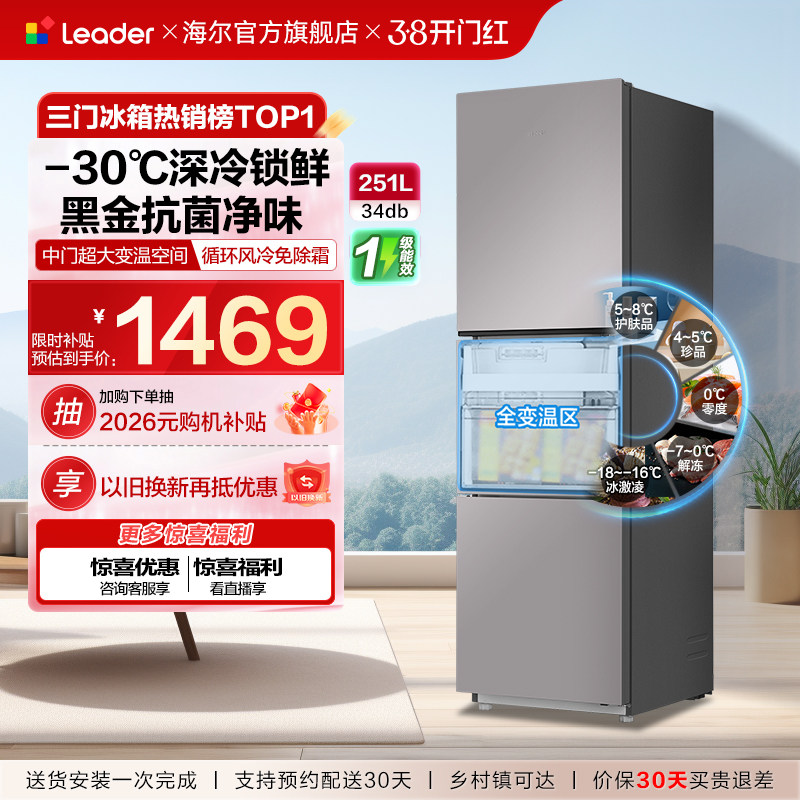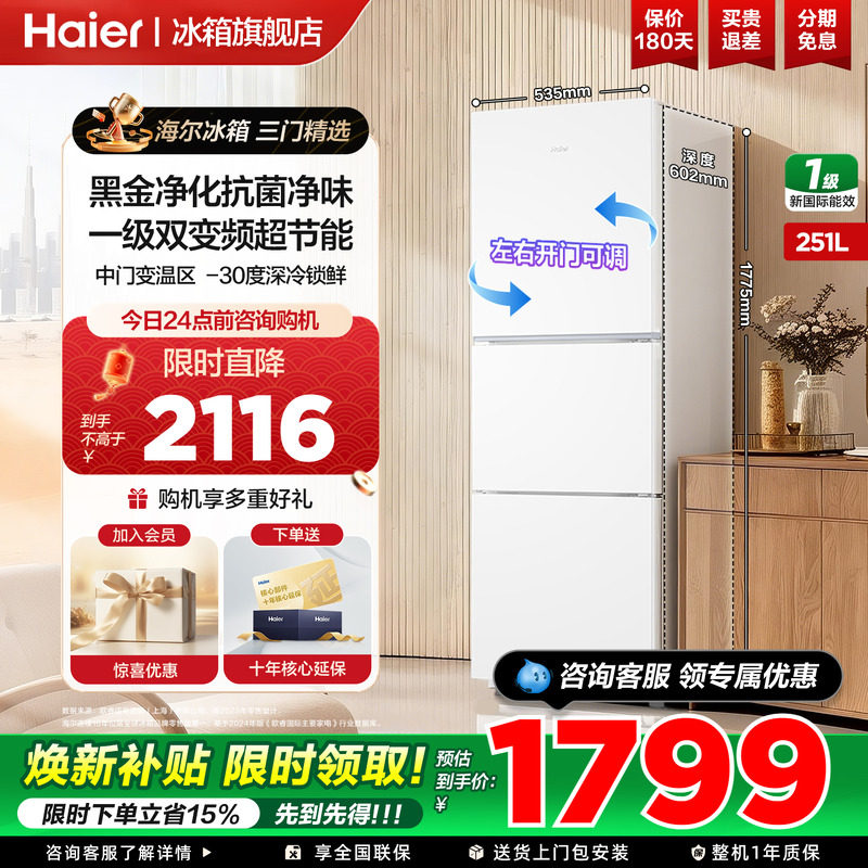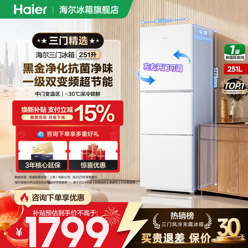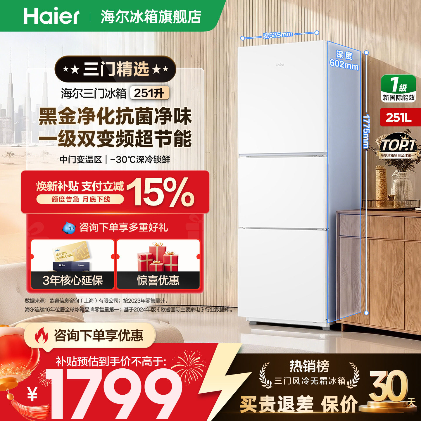 以旧换新海尔出品统帅三开门251L一级风冷无霜租房小型家用电冰箱