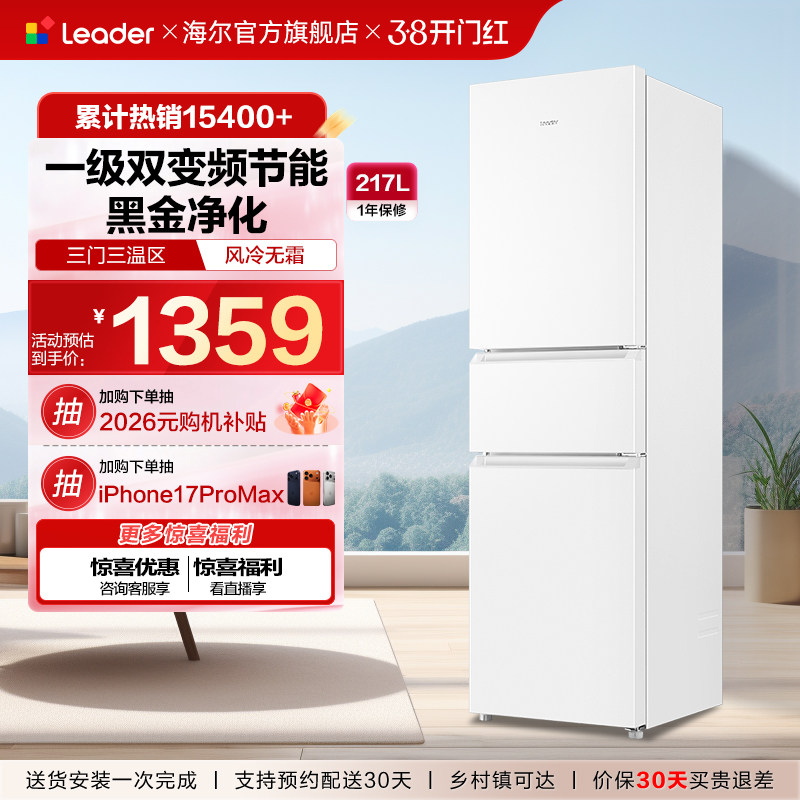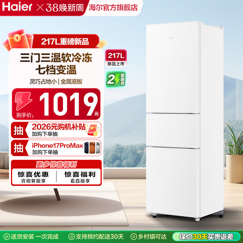 [一级能效]海尔电冰箱217L升风冷无霜家用小型三开门官方旗舰店