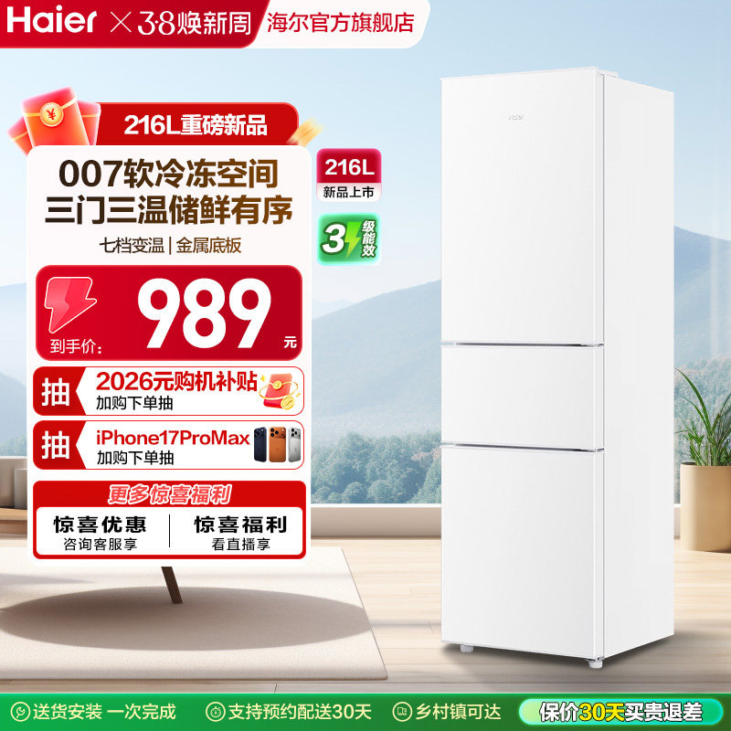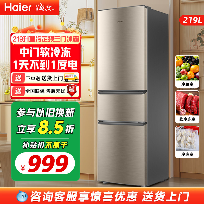 海尔电冰箱219L直冷三开门家用小型216升无霜节能出租房宿舍补贴