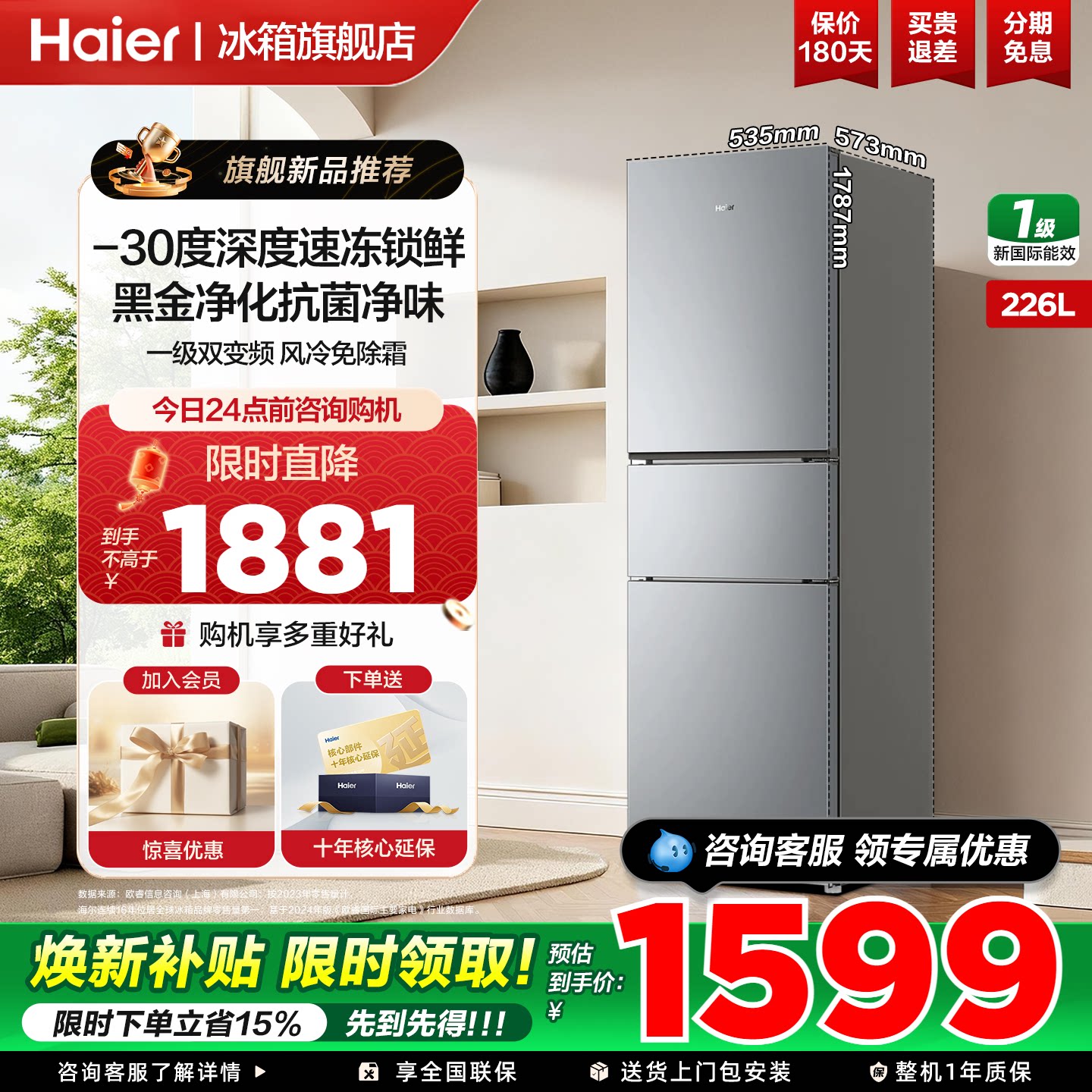 海尔冰箱226升家用冰箱三开门软冷冻保鲜一级能效变频风冷无霜