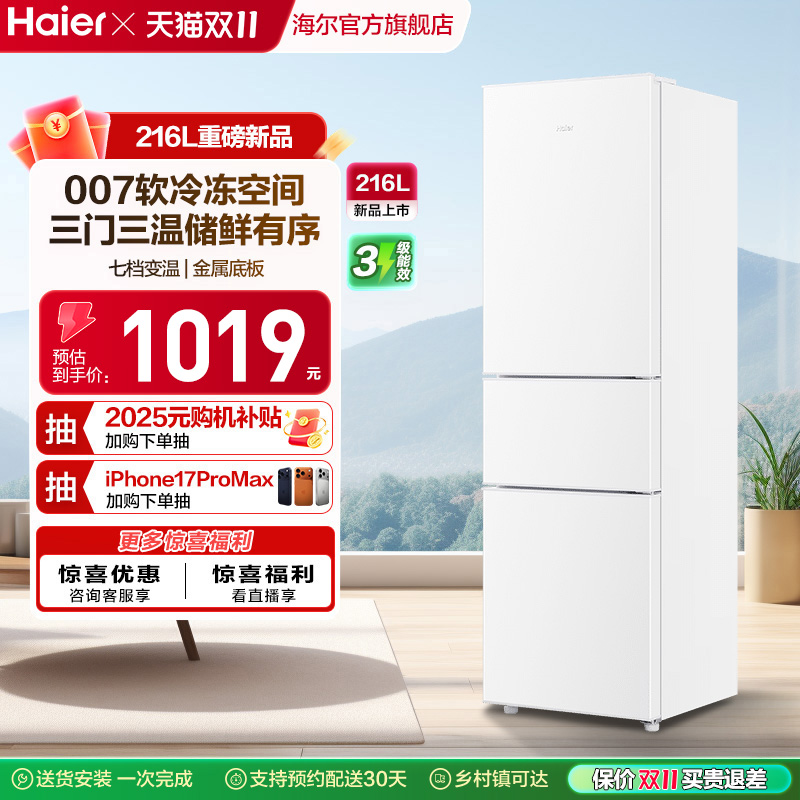 [换新补贴]海尔三开门219L/216升电冰箱家用小型节能租房宿舍旗舰
