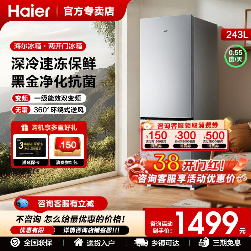 以旧换新补贴海尔电冰箱两门243升226三开门家用小型节能风冷无霜