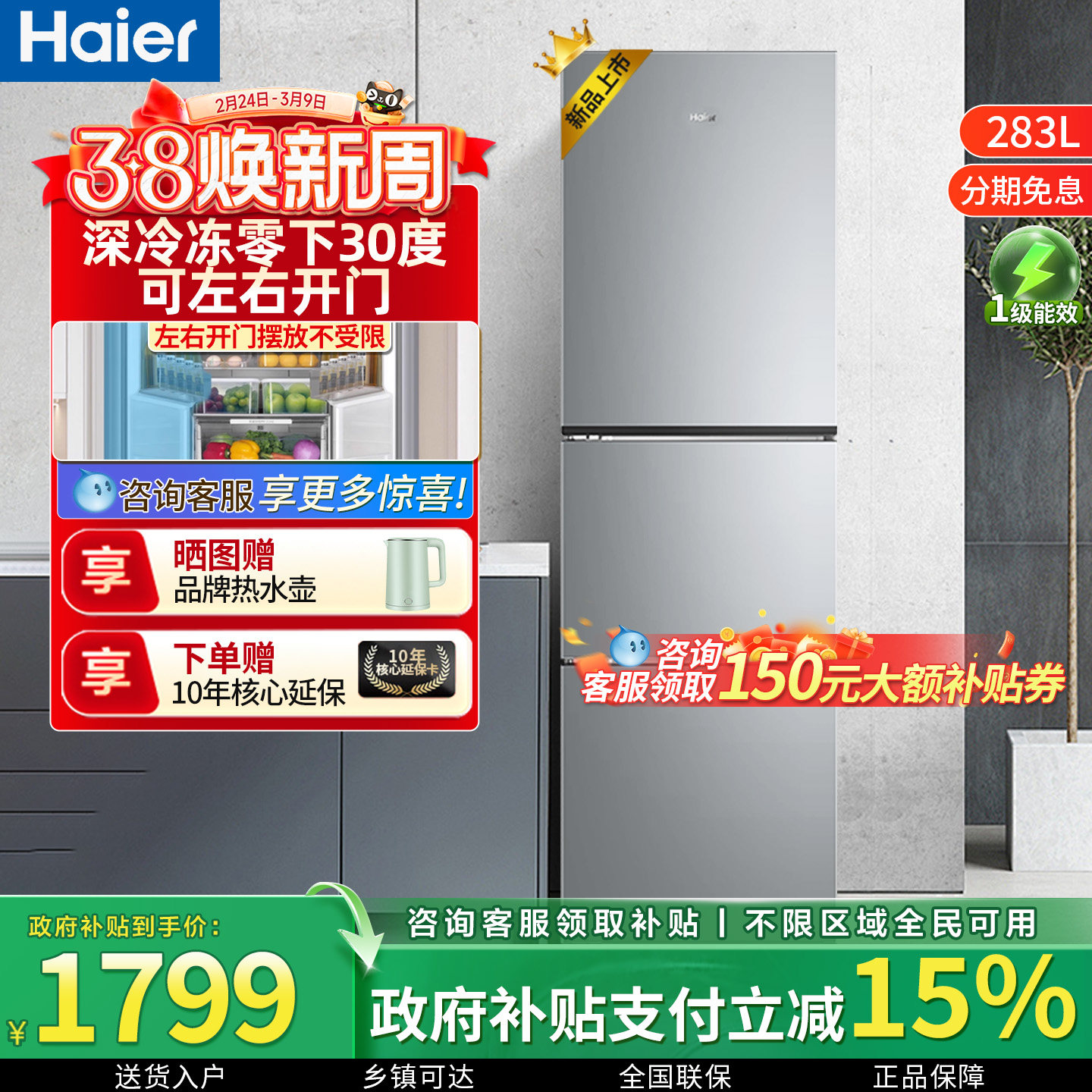 【金属底板】海尔冰箱285/283升双门三开门一级变频小型官方正品
