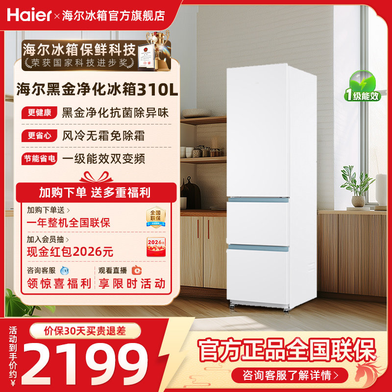 换新补贴海尔310L三开门小冰箱白色超薄风冷家用一级能效冰箱官方