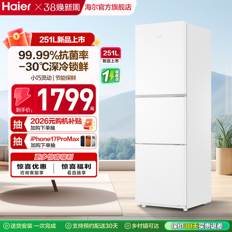 海尔251L一级能效家用租房宿舍三开门风冷无霜保鲜节能白色小冰箱