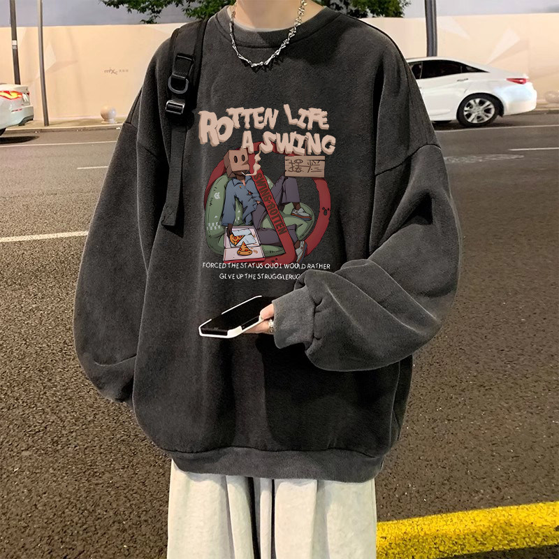日系潮牌水洗做旧山系印花圆领卫衣男春秋新款宽松百搭套头上衣潮