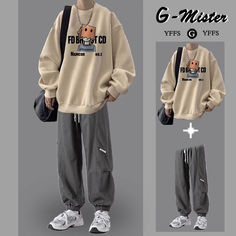 春秋款复古日系潮牌圆领卫衣套装男休闲痞帅潮流冬季加绒重磅上衣