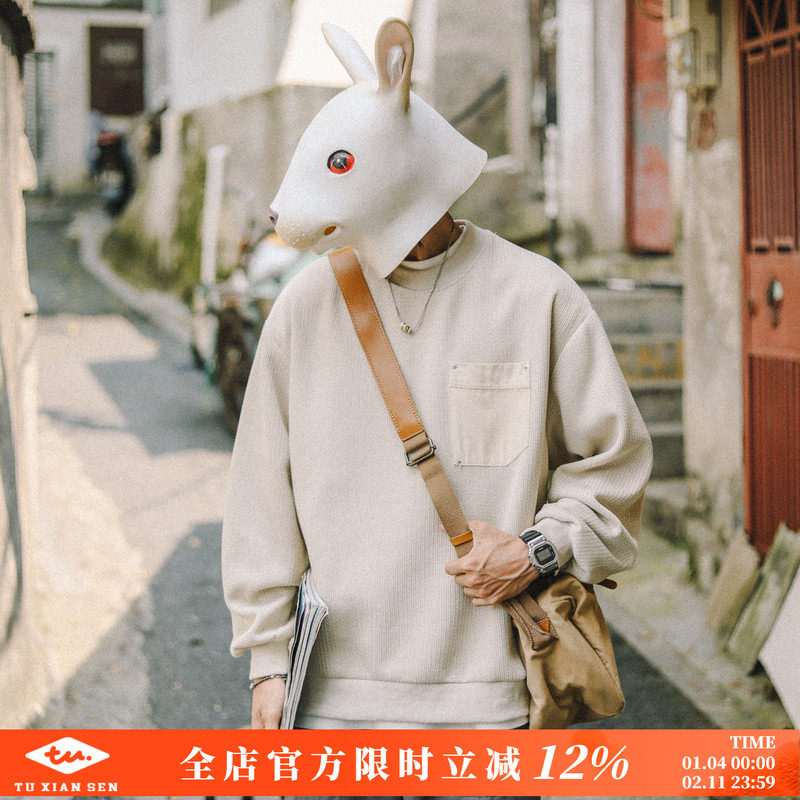 兔先森春秋日系复古口袋拼接重磅圆领卫衣男潮牌宽松休闲情侣上衣