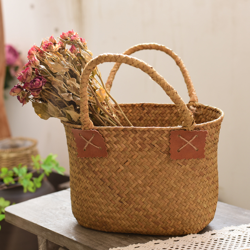 海草编花篮干花插花摆件复古手工编织藤编手提包杂物收纳篮装饰品