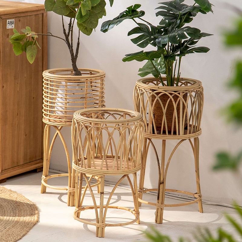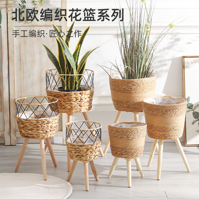 北欧藤编草编花篮木质高脚花架子客厅落地式客厅民宿装饰绿植花盆