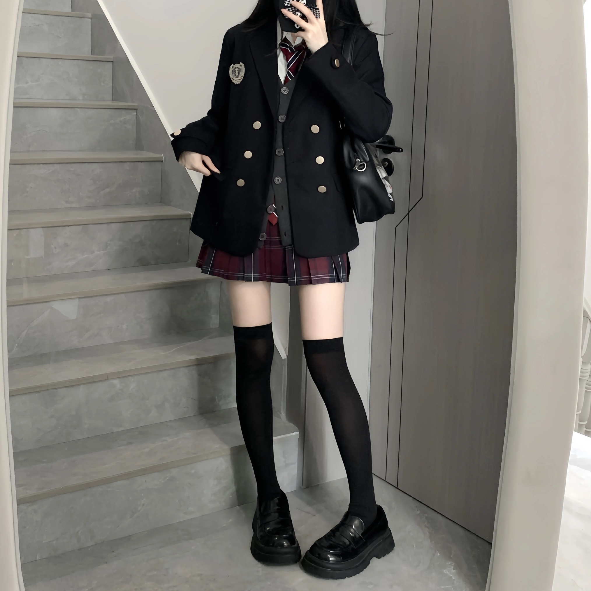 jk制服原创格子裙女生西装黑色藏蓝西服茶色校供感西服半身裙套装