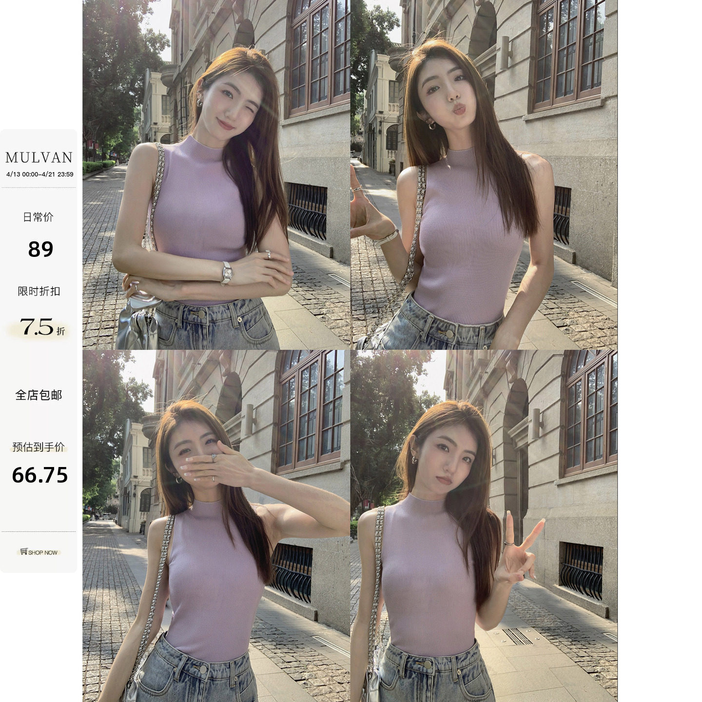 MULVAN 半高领针织衫背心女夏季韩系外穿修身t恤显瘦无袖吊带上衣