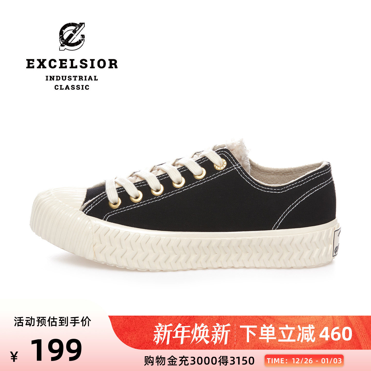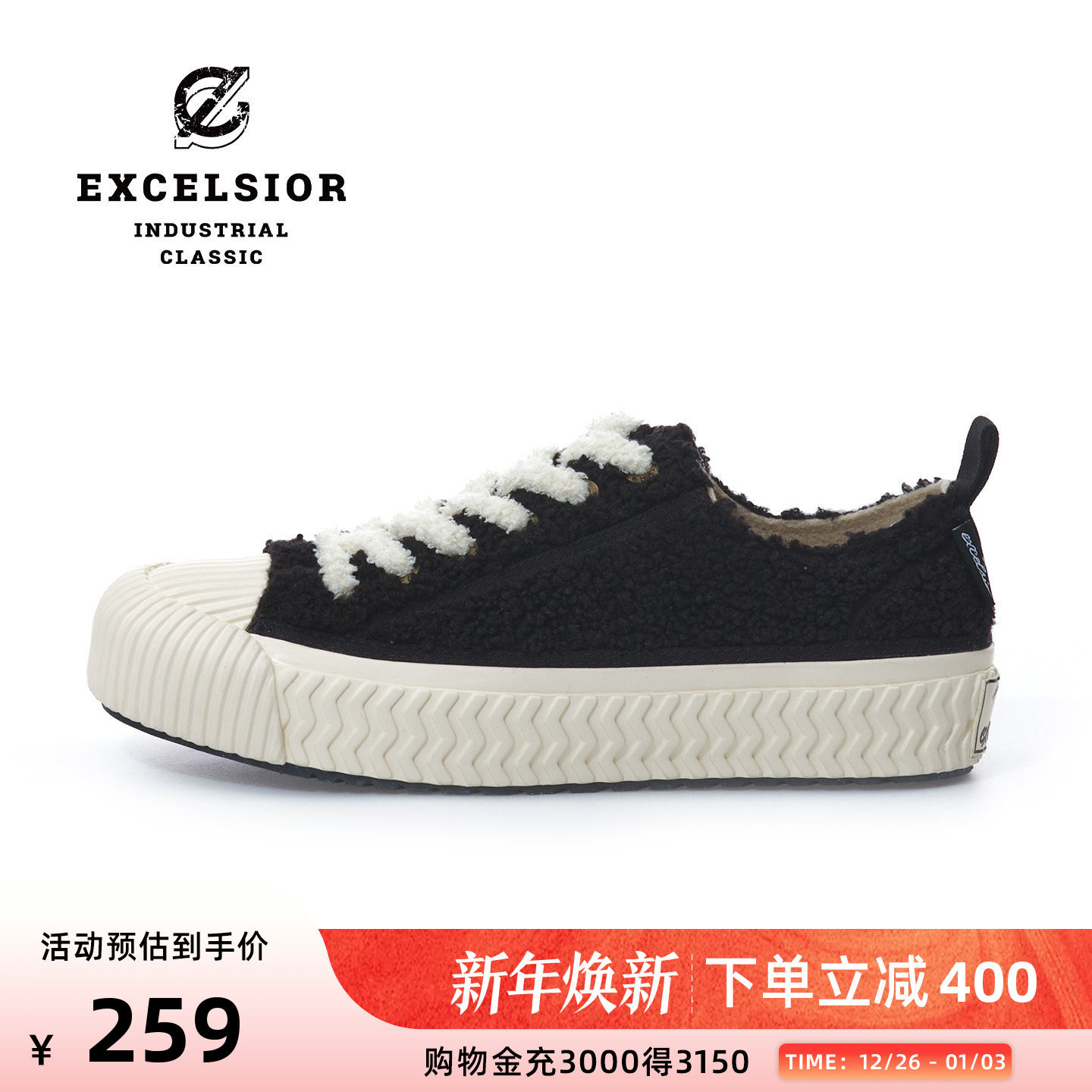 excelsior饼干鞋官方 冬季加绒板鞋低帮黑色休闲鞋男厚底帆布鞋女