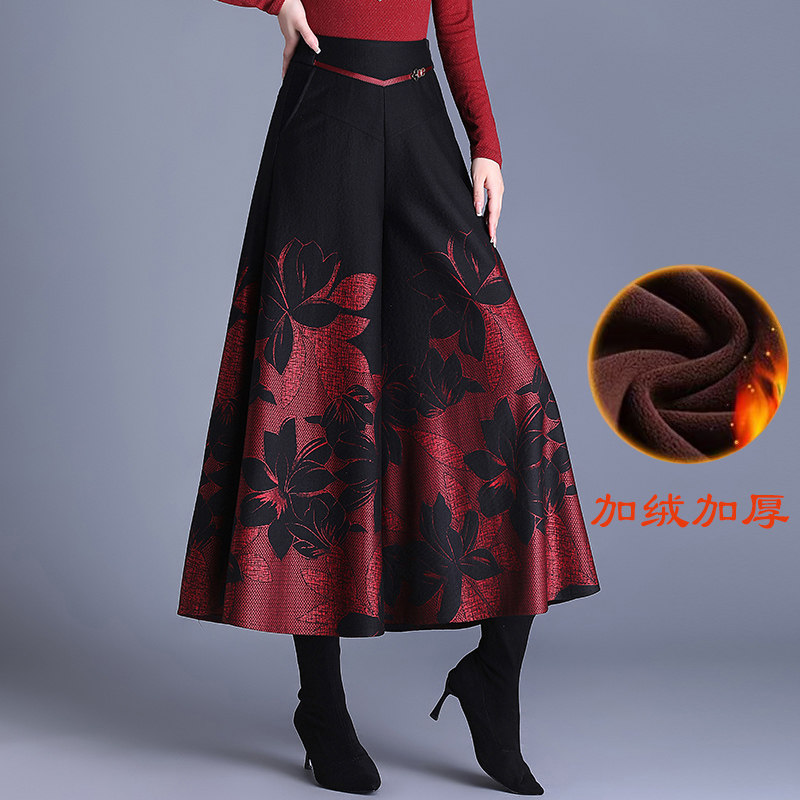 提花毛呢阔腿裤女秋冬新款高腰妈妈裤子时尚宽松显瘦九分大脚裙裤