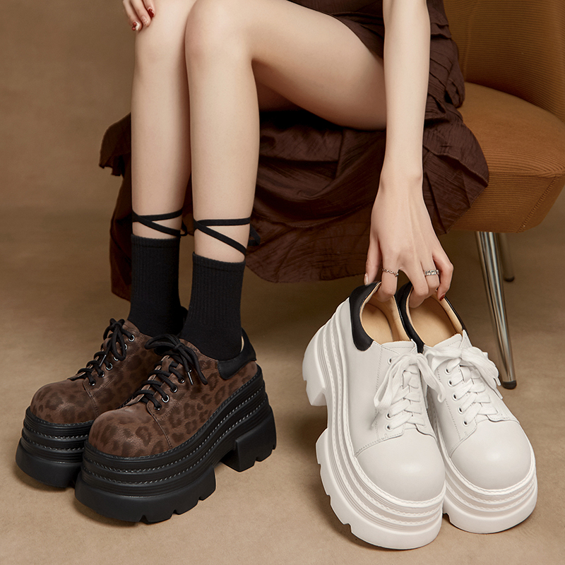 学院风小个子厚底女鞋增高休闲鞋全真皮单鞋绑带松糕跟乐福鞋豹纹