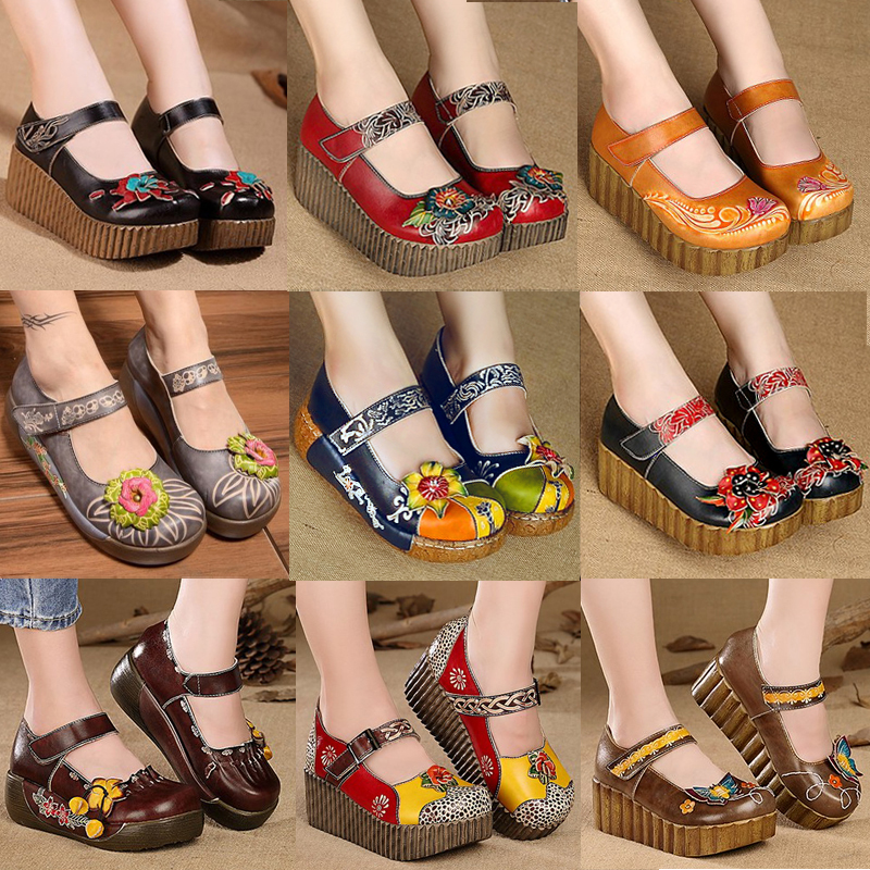 2025春夏新款原创民族风牛皮女鞋厚底松糕跟平底花朵真皮手工单鞋