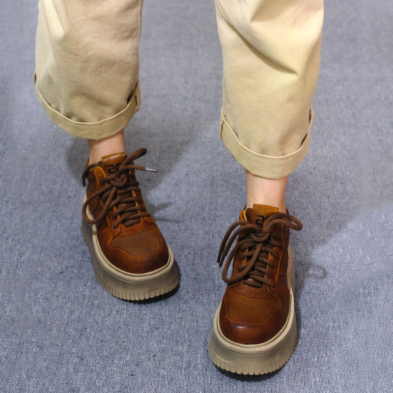 小婉高品质头层牛皮松糕跟单鞋女秋冬时尚休闲系带厚底做旧复古鞋