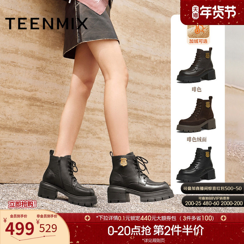 天美意粗跟厚底增高加绒英伦马丁靴女鞋子休闲短靴皮靴2025冬新款