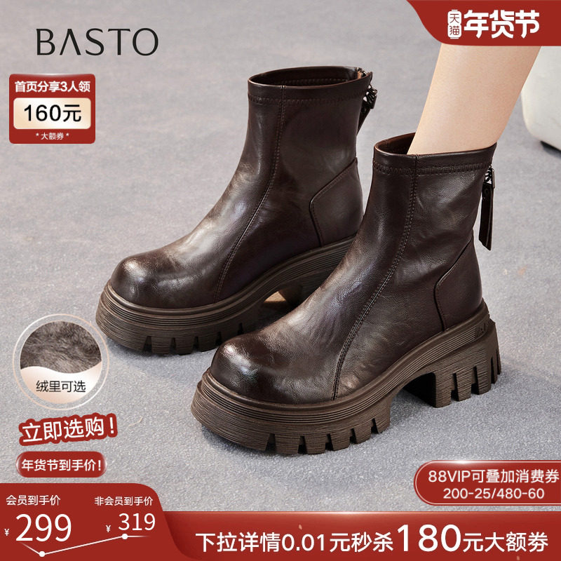 百丽复古厚底增高加绒保暖马丁靴女鞋冬款粗跟休闲短靴子E8V1DDD5